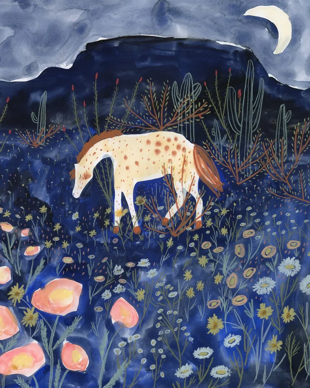 Melissa’s work is a vibrant celebration of the American Southwest, deeply influenced by the wide-open spaces, starry nights, and the hardy, magical animals that thrive in the desert. Growing up with a childhood dream of becoming a cowgirl, she now lets that nostalgia gallop through her paintings—populating her canvases with "floating cowboys," three-legged pink coyotes, and smiling roadrunners. Her style is characterized by a playful, loose approach that prioritizes joy and experimentation over rigid planning.