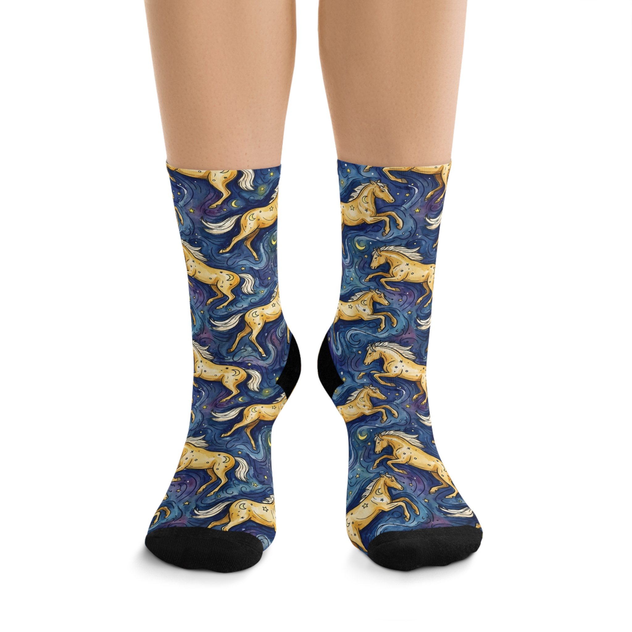 There is nothing quite like the glow of a Palomino in the sun—a coat of gold and a mane of ivory. These socks feature a continuous, all-over dancing print inspired by our Palomino, capturing the spirit of freedom we want for every horse that enters our gates.